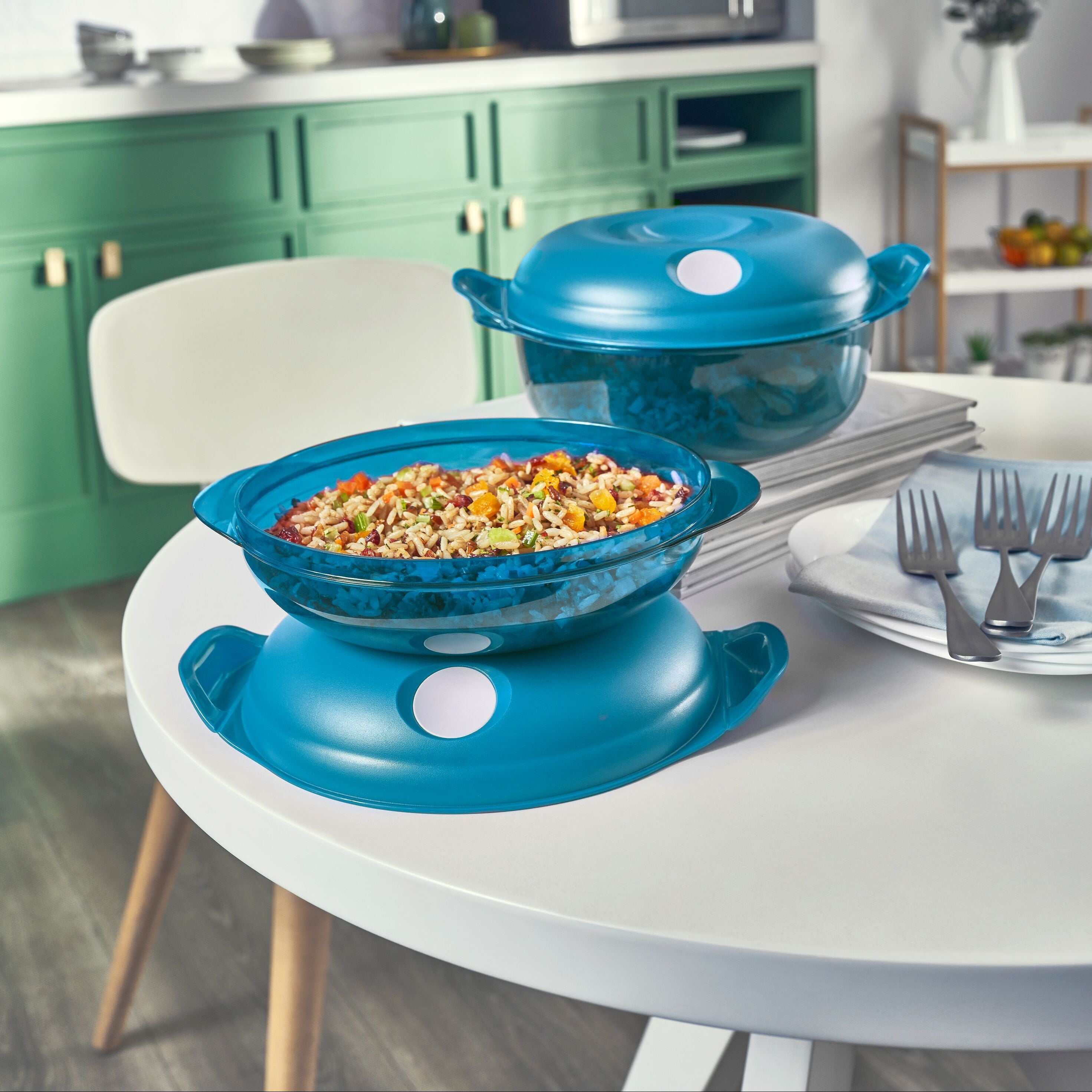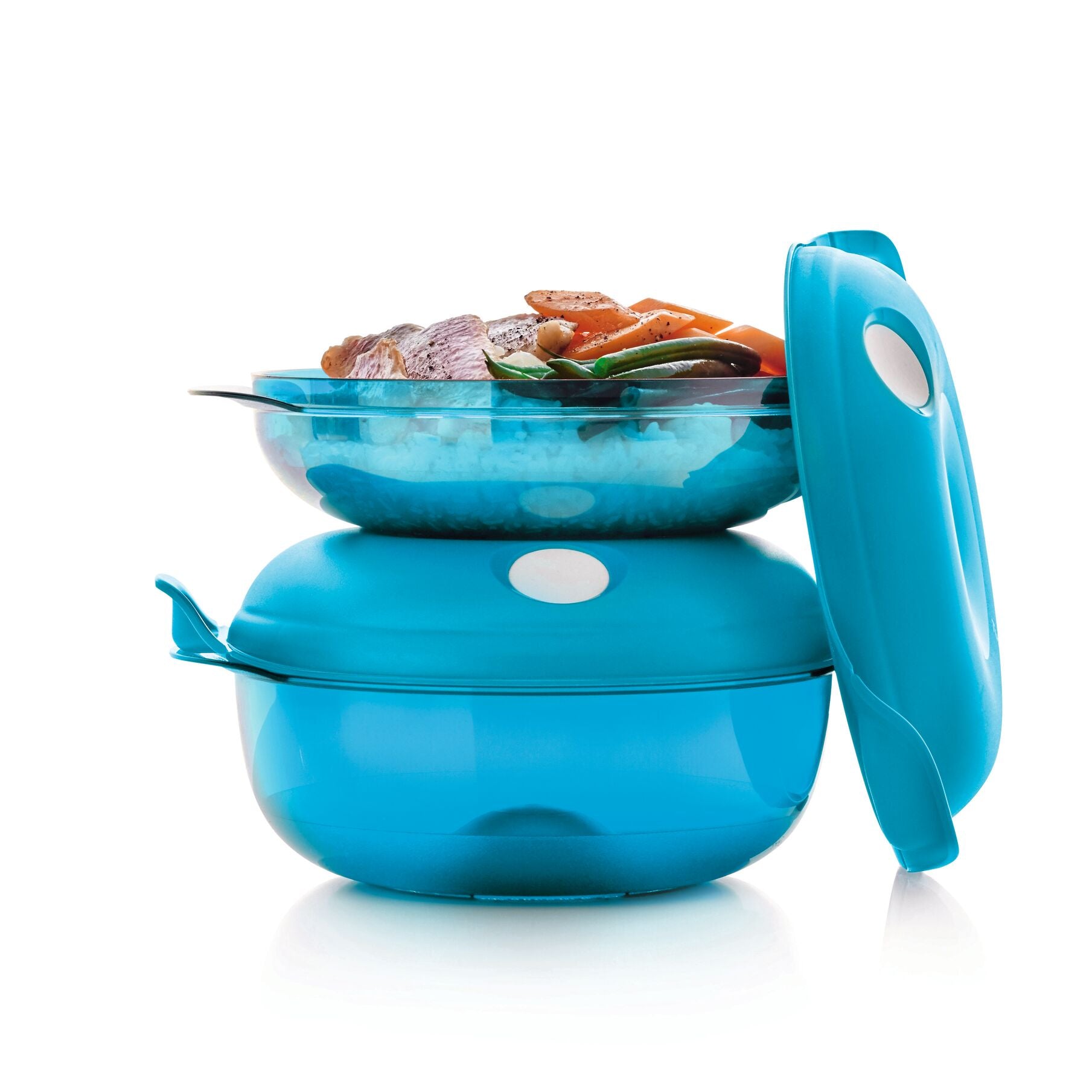 The Tupperware Heat N Serve container is designed with a unique doughnut shape and clever automatic valve to better distribute heat, ventilate steam, and warm food evenly.