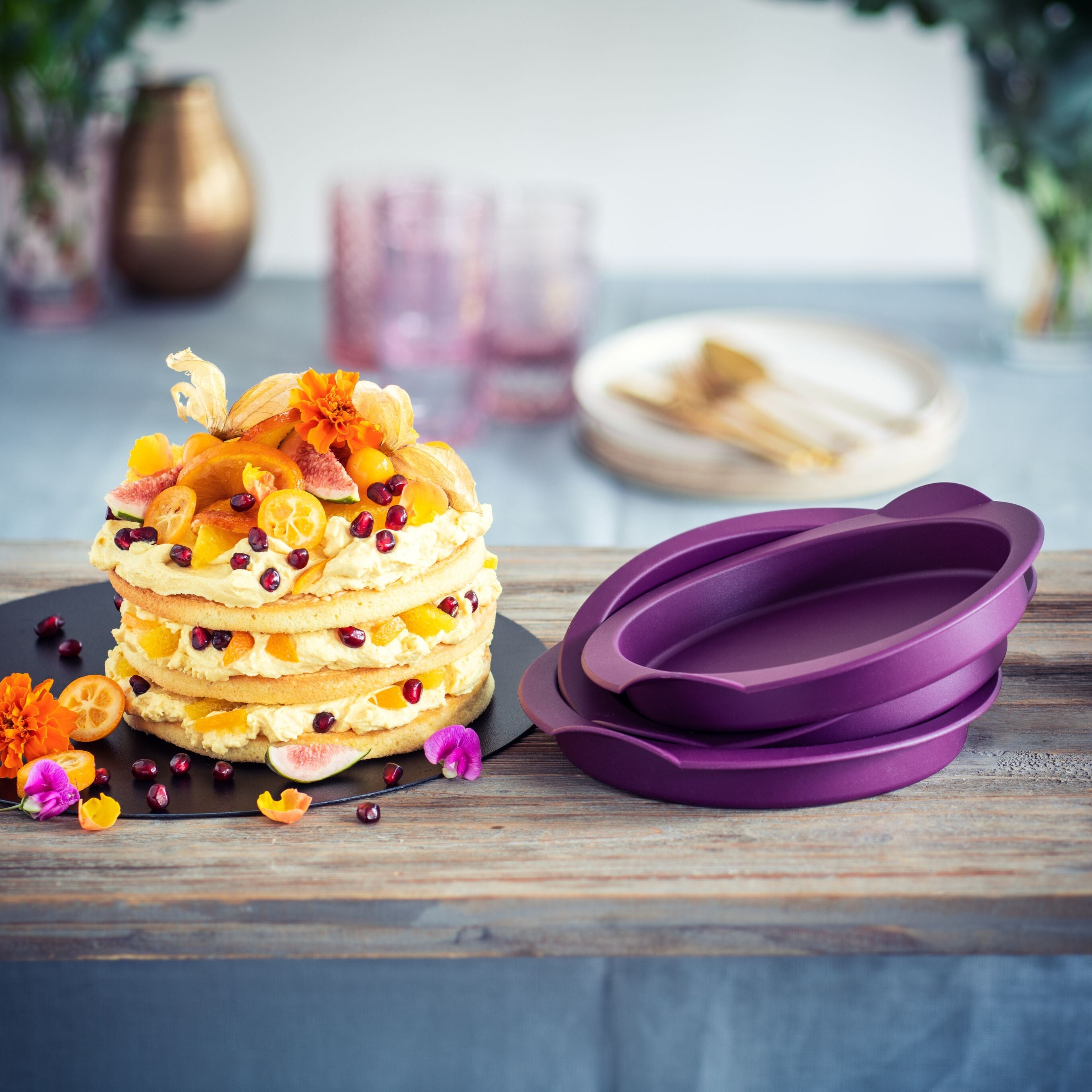 Create round cakes, pies, flans, chilled desserts, frozen sweet or savory dishes and so much more with this easy-to-clean round baking form. Made from Tupperware silicone, a wondrous non-stick material safe for the fridge, freezer, microwave and oven that makes it easy to unmold all your delicious creations.